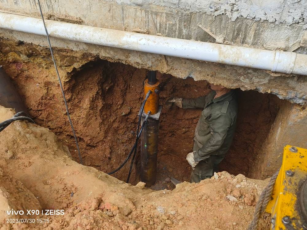 在操作坑內(nèi),利用千斤頂將預(yù)制樁逐段壓入土中。壓樁時需控制樁位,確保樁尖定位準(zhǔn)確,樁節(jié)垂直誤差不得大于15mm。